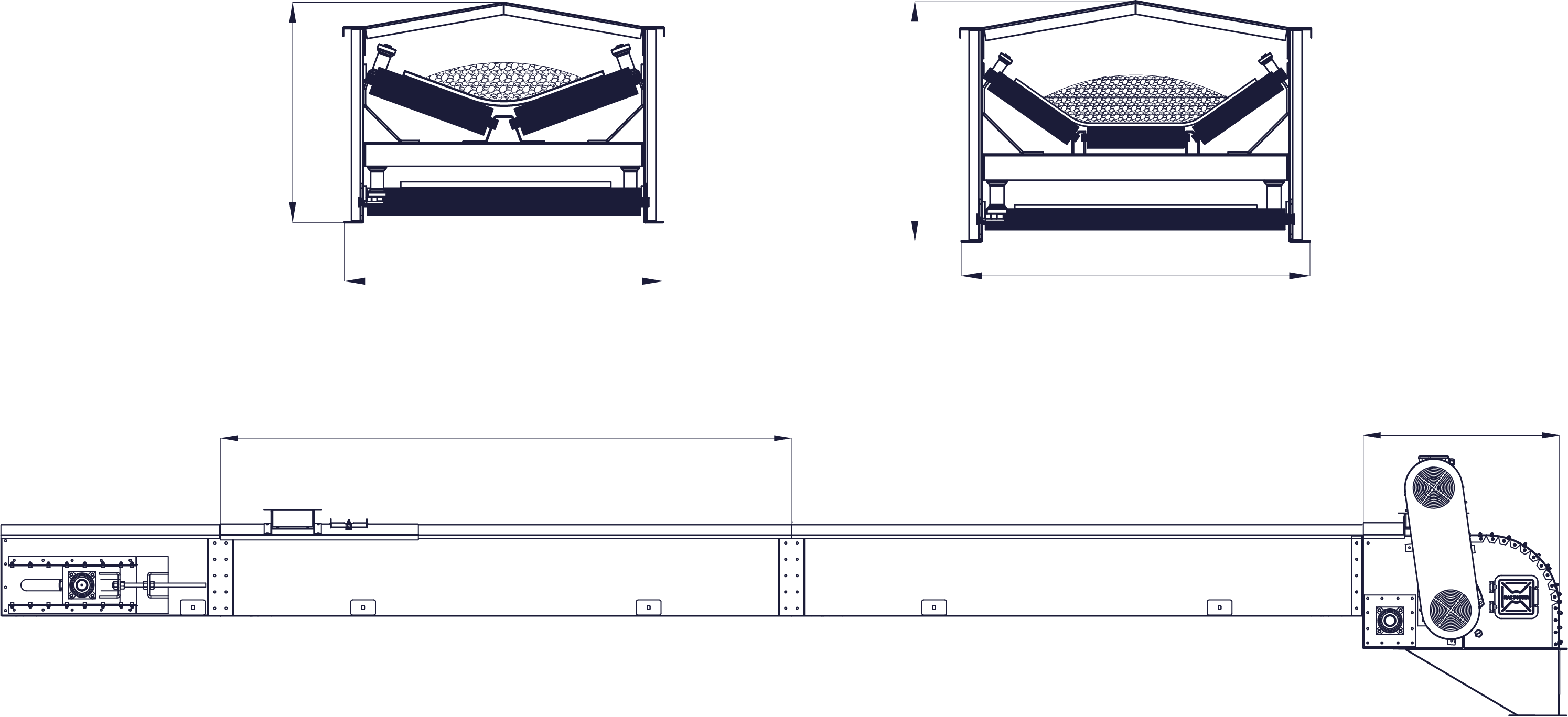 R Model bant konveyörler taşıyıcı rulolar sayesinde farklı ürünler ve kapasitelerde taşıma yapar. R model optimum bant hız 1,5 m / sn dir.